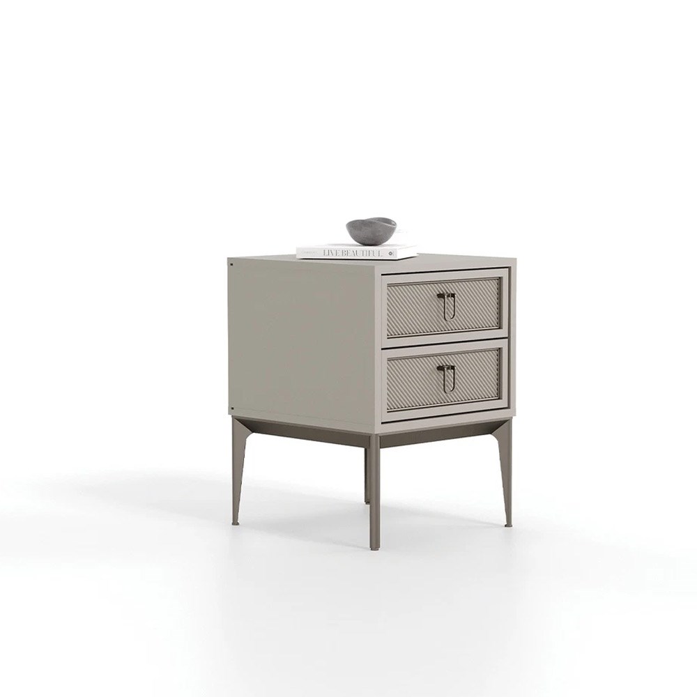 Прикроватная тумбочка HERA с двумя выдвижными ЯЩИКАМИ каменного цвета придает спальне минималистичный вид, дополняя эстетику блестящими бронзовыми ручками и металлическими ножками цвета матовой бронзы, а конструкция с 2 выдвижными ящиками подчеркивает функциональность.