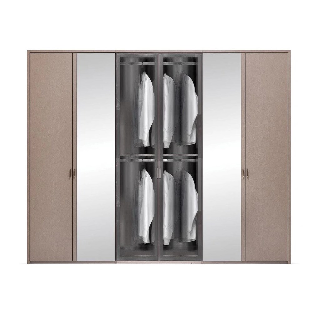 6-ДВЕРНЫЙ ШКАФ BERTA, демонстрирует богатый дизайн с современным стилем оформления и привлекательными деталями дизайна, идеально дополняет современную элегантность этой серии. В то время как он предлагает утонченный внешний вид благодаря покрытию с текстильной текстурой, обогащенному металлическими эффектами, характерными для Enza Home, он обеспечивает необходимый порядок в спальне с 3 модулями выдвижных ящиков и внутренними перегородками в верхнем ящике. Металлические ручки цвета античной бронзы, а также зеркала и стеклянные крышки натурального цвета придают спальням эстетический вид высокого уровня.