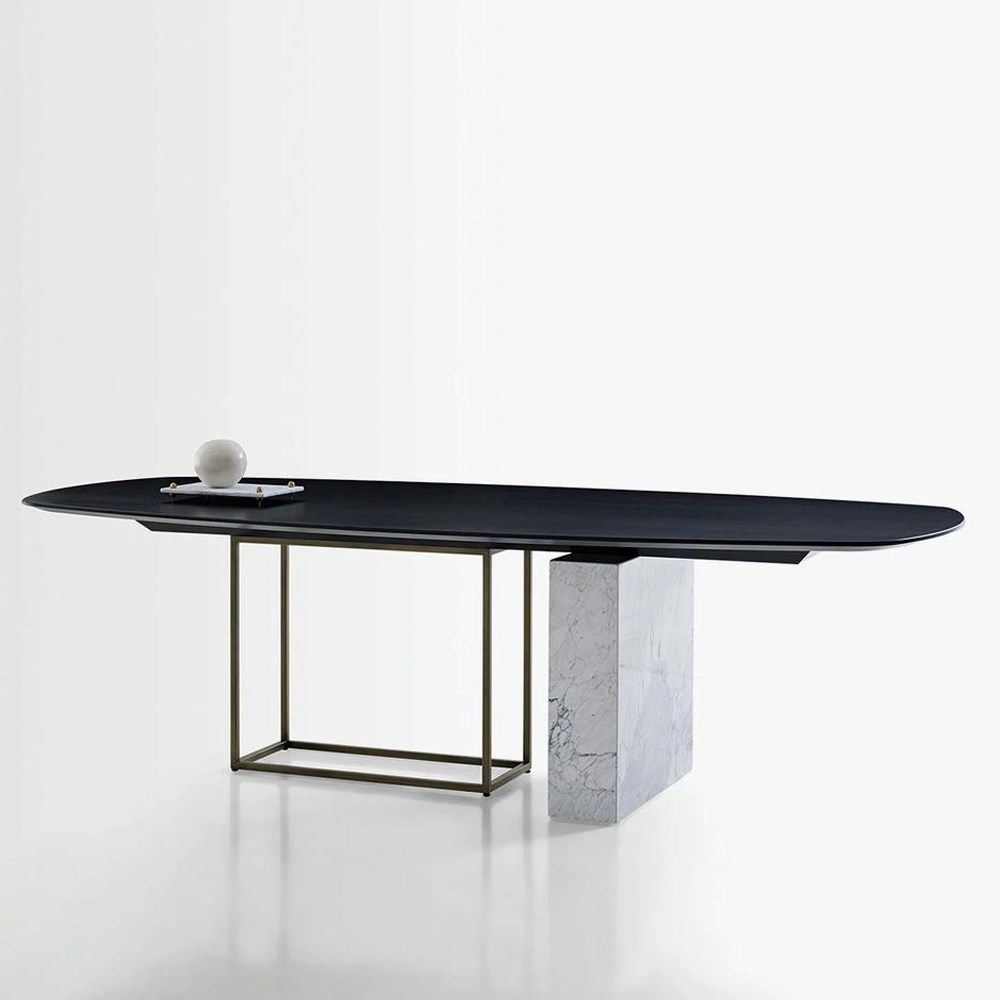 СТАЦИОНАРНЫЙ СТОЛ KARTUM придает стильную интерпретацию декору благодаря столешнице, покрытой шпоном черного дуба, и выделяет жилые помещения благодаря качественным деталям дизайна.