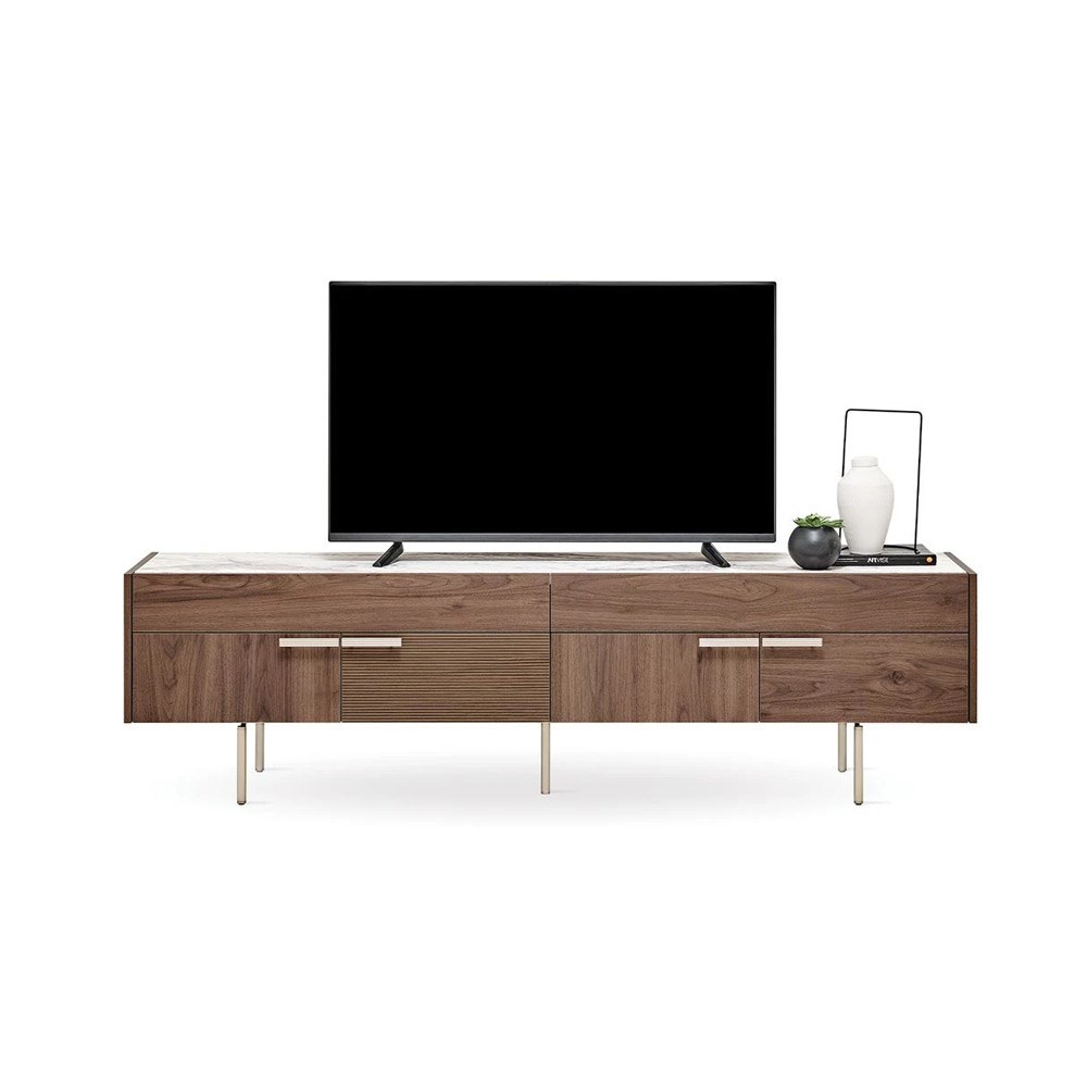 ТВ тумба PAVIA, отличающийся текстурой дерева теплого орехового цвета, где натуральность находится на первом плане, подчеркивает привлекательные детали дизайна этой серии с нанесением рисунка под мрамор и матовой металлической ручкой цвета нержавеющей стали. конструкции ног.